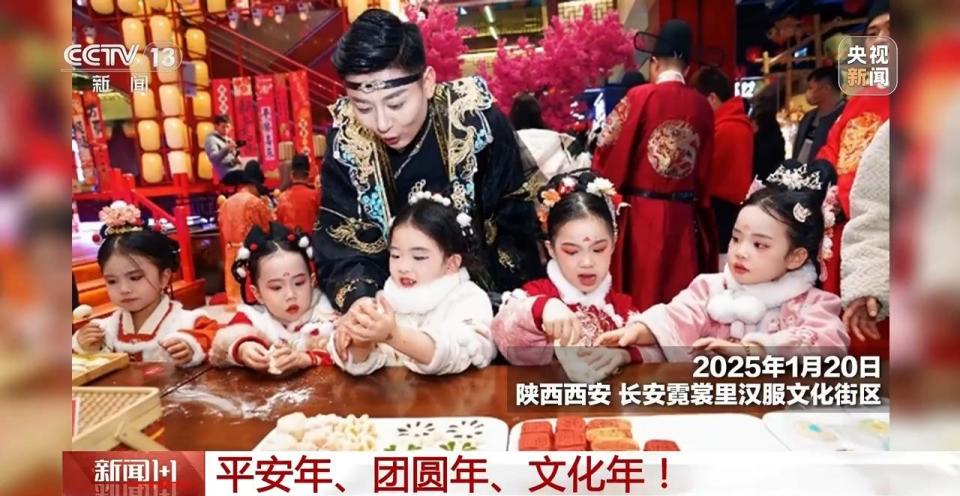 # M* Q1 X9 E2 ?5 v; @7 u. q3 a& x( f在西安,长安霓裳里汉服文化街区里,小朋友们身着汉服,包饺子、做糕点,体验非遗文化。