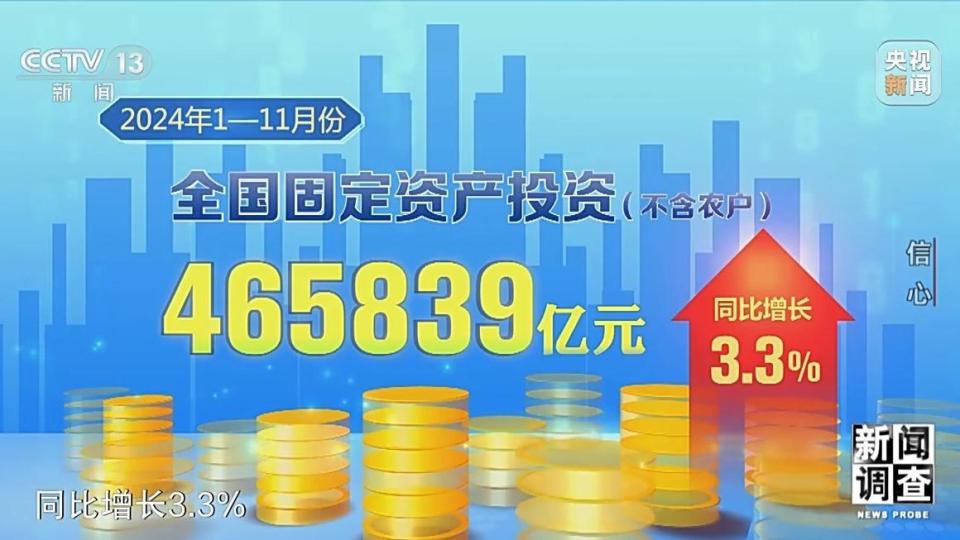 2024年1月至11月,全国固定资产投资(不含农户)465839亿元,同比增长3.3%。高技术产业投资同比增长8.8%。“两重”建设持续推进,基础设施投资稳定增长。1月至11月,基础设施投资同比增长4.2%,增速比全部投资高0.9个百分点。
