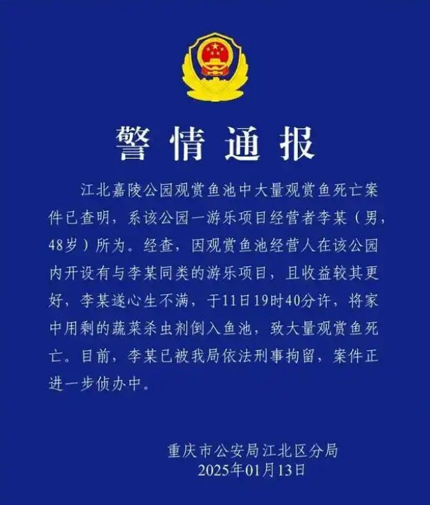 3、公园观赏鱼大量死亡,警方通报 13日,重庆市公安局江北区分局发布通报,江北嘉陵公园观赏鱼池中大量观赏鱼死亡案件已查明,系该公园一游乐项目经营者李某(男,48岁)所为。经查,因观赏鱼池经营人在该公园内开设有与李某同类的游乐项目,李某遂心生不满,于11日19时40分许,将家中用剩的蔬菜杀虫剂倒入鱼池,致大量观赏鱼死亡。目前,李某已被刑事拘留。(@平安江北)