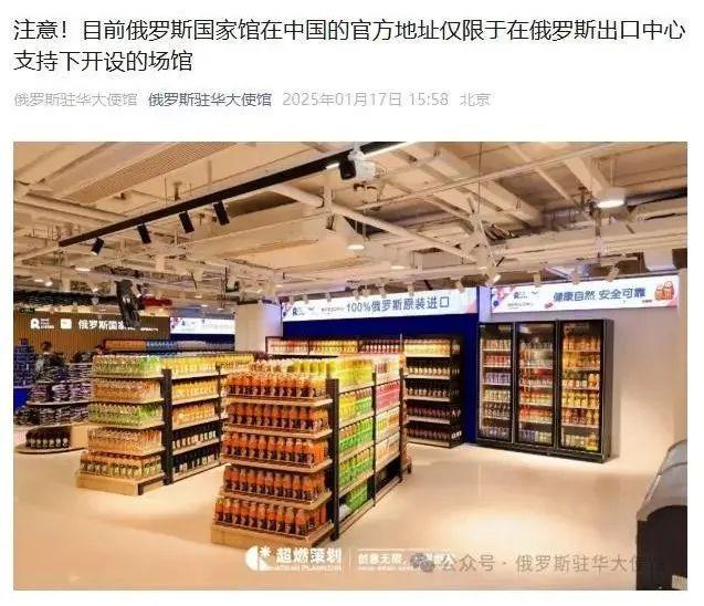4、“俄罗斯国家馆”山寨遍地,俄方澄清 俄罗斯驻华大使馆1月17日提醒:目前俄罗斯国家馆在中国的官方地址仅限于在俄罗斯出口中心支持下开设的场馆。俄驻华使馆表示,一些商店打着俄罗斯产品的幌子销售假冒产品或非我国生产的产品。这些产品往往不符合质量的要求但在包装上却使用俄文来模仿俄罗斯原产地。(俄罗斯大使馆微信公众号)