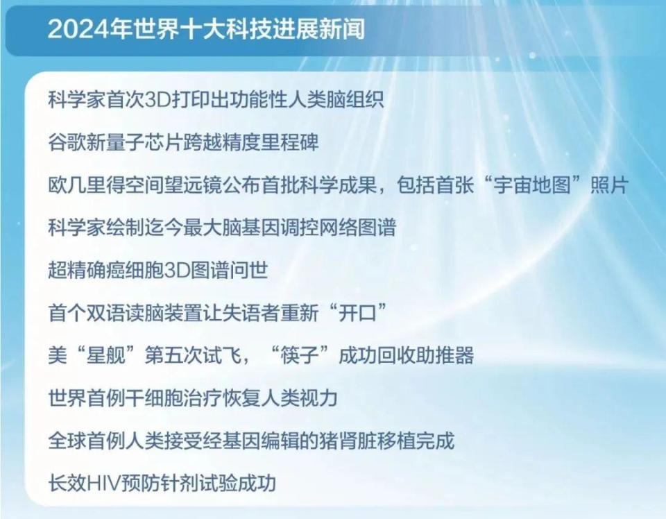 - y% B4 d9 L Y2 @' W& x l“两院院士评选2024年中国/世界十大科技进展新闻”至今已举办31次。评选结果经新闻媒体广泛报道后,使公众进一步了解国内外科技发展动态,对普及科学前沿知识起到了积极作用。