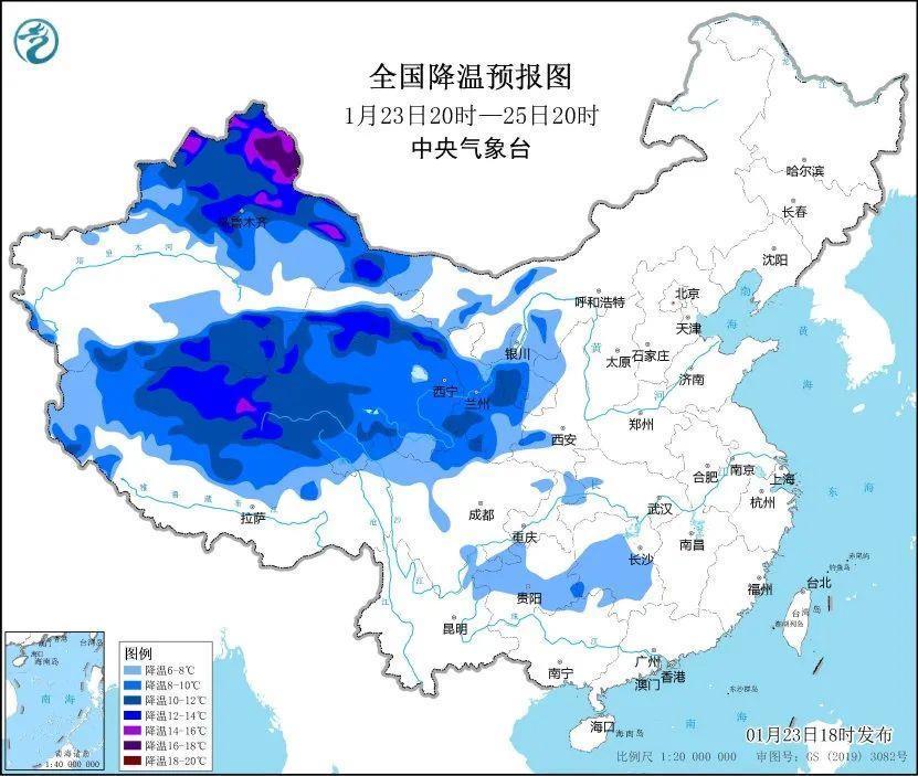 中央气象台23日18时发布寒潮蓝色预警,预计,23日20时至25日20时,新疆北部、西藏中北部、青海大部、甘肃大部、宁夏南部等地将先后降温8℃~10℃,其中,新疆北部、西藏北部、甘肃西部等地部分地区降温可达12℃以上。5 L+ i6 g5 H& i# B