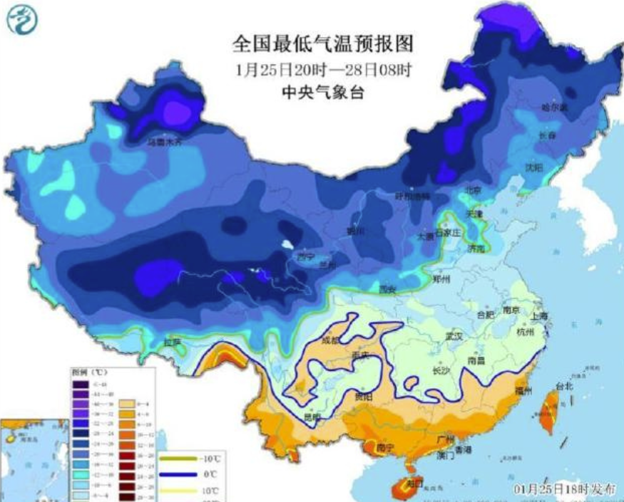 4、大风寒潮暴雪大雾四预警齐发 中央气象台25日18时发布大雾黄色预警、寒潮黄色预警、大风黄色预警、暴雪蓝色预警。受寒潮影响,25日夜间至27日,我国中东部大部地区将出现明显大风降温天气,27日和28日最低气温0℃线将南压到江南南部至贵州南部和云南北部一带。(中国新闻网)) v! R5 K4 Y2 G. c
