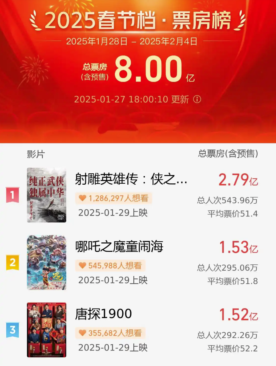 " ]; G4 G/ w- A4 N) }4、再创纪录!已破8亿 截至27日12时40分,2025年春节档档期预售票房达7.36亿,已经超过去年春节档最终预售票房成绩,并刷新多项影史纪录。(人民日报)' d. W) i: ]& i- `9 x