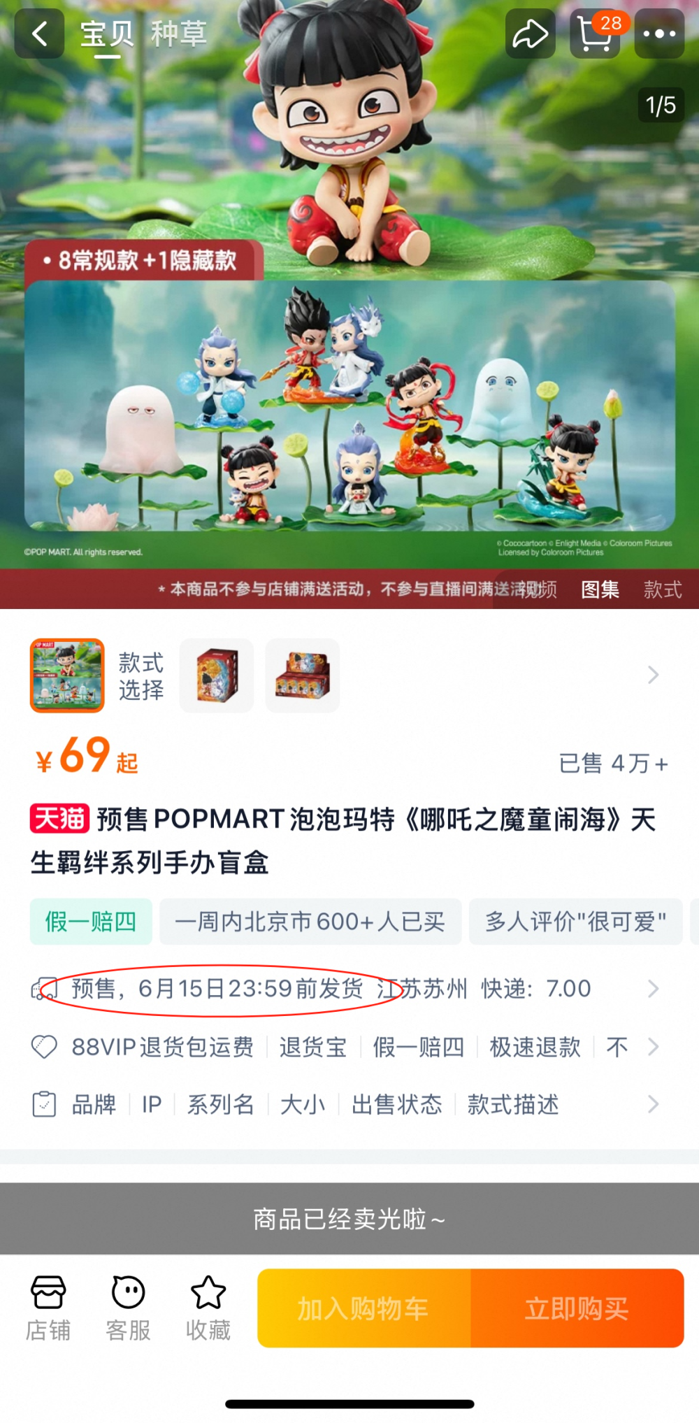 除了票房火爆,《哪吒》的IP衍生产品出现热销。目前,《哪吒》系列电影已陆续推出多款衍生产品,包括盲盒、手办、徽章等。据央视新闻报道,《哪吒2》合作消费品牌达12个,其中9个为衍生品合作,与玩具品牌联名推出的盲盒产品在全国多地脱销,线上发货已排至6月份。( _) f9 z! Y" x. b