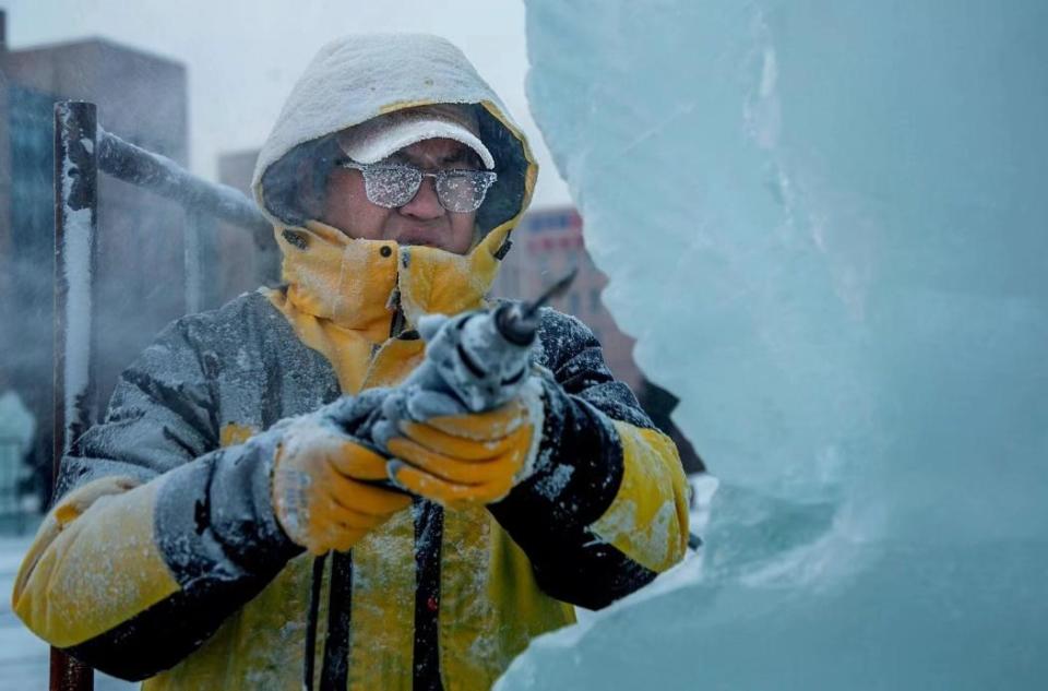 - j7 r6 P4 `& k7 k! \张维信进一步揭秘了冰雕师的工作之不易,他们有着20岁到50岁的较大年龄跨度,每天的工作时长基本在12小时左右,并且要面临寒冷气候的考验和高空作业的风险。在雕刻阶段,要先用电锯或油锯把冰块切割出大致的形状,再用刻刀去精雕细琢。由于原材料的特殊,和石雕、木雕相比,冰雕创作受时间和温度的限制大,且不同于泥塑可以缺了再补,冰雕不可以浇水再成冰,是一门“减法的艺术”。