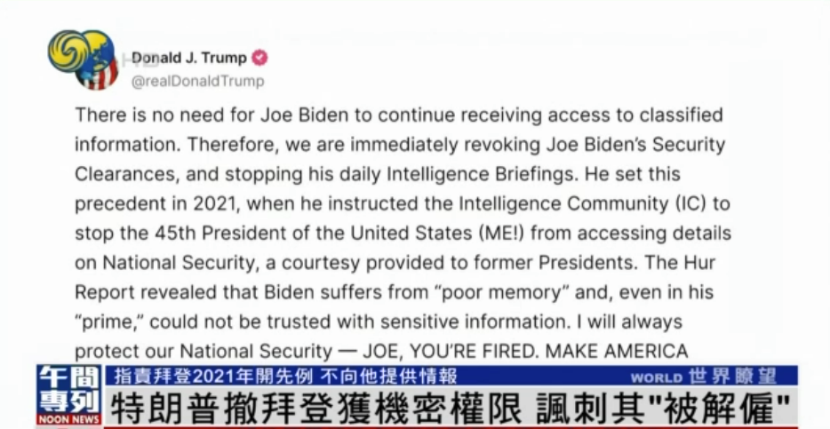# e- @* a5 q* k: L5 u6 q8 q! t美国总统特朗普7日宣布,立即取消前总统拜登获得机密信息的权限,并停止向他提供每日情报简报。特朗普在社交媒体发文说,拜登没有必要继续获得机密信息,他表示拜登记忆力差,即使在“巅峰时期”,也不能把敏感信息托付给他。特朗普还在贴文中暗讽道,“乔,你被解雇了”。按照美国政界传统,前总统即使在离任后也有权接收机密信息,但是特朗普称,拜登曾于2021年指示情报界停止向他提供国家安全详情。