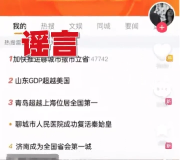3、男子造谣医院复活秦始皇被罚 近日,山东聊城一网民在某网络平台发布虚假视频信息,该信息为“P图”伪造微博热搜榜图片,包含“聊城市人民医院成功复活秦始皇”“山东GDP超越美国”等不实言论。该信息发布后,视频累计播放量达23万人次,转发1.4万次,迅速引发网民热议,造成不良社会影响。目前,违法行为人聂某某(男,现年25岁,阳谷县西湖镇人)已被当地警方依法行政处罚。(@中国警方在线)/ C! i+ n- U3 i: c# s