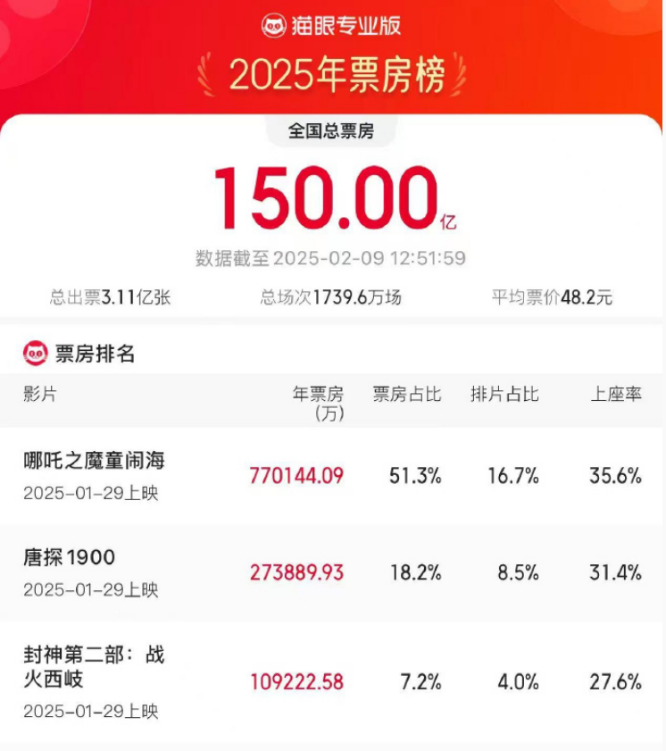 5、2025电影票房破150亿  据网络平台数据,2025年2月9日12时51分,2025年度票房(含预售实时)破150亿,《哪吒之魔童闹海》以超51.3%的票房占比强势领跑年度票房榜。(@央视新闻)% {0 G, k# ^* M) V4 G* o; w! [