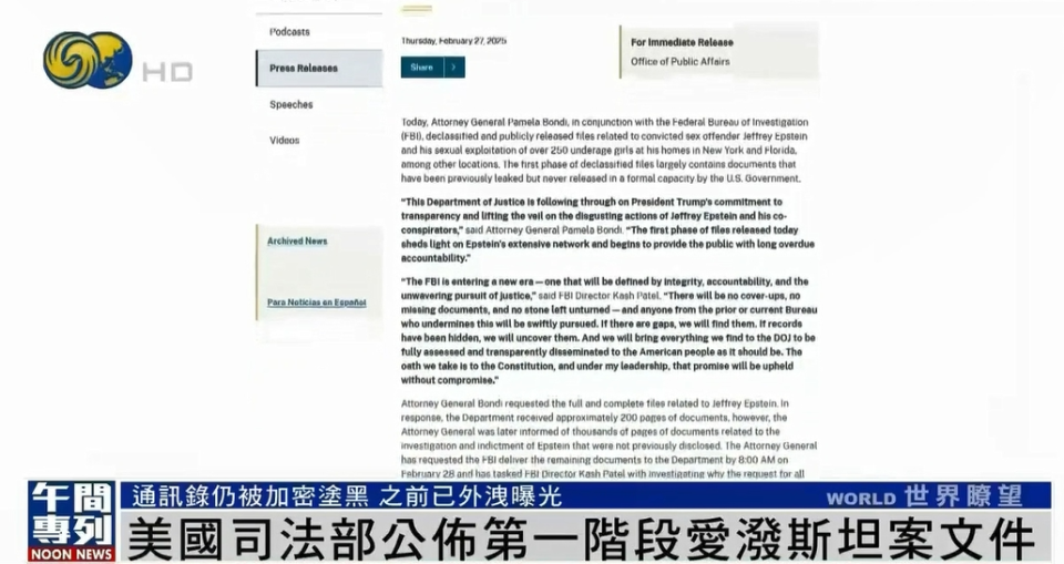 , i& x, O' I; T0 o美国司法部公布第一阶段爱泼斯坦案文件 5 S+ r# o) k3 N3 I) a