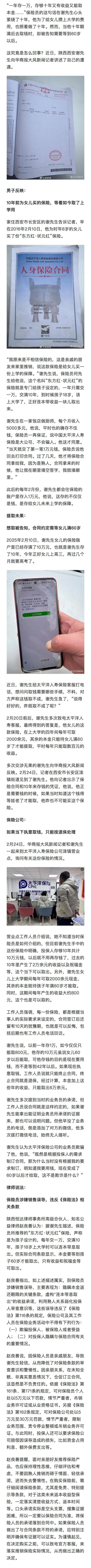 - h2 f- d' x" J( P近日,陕西西安谢先生告诉记者,10年前他给只有8岁的女儿买了份保险,保险员声称一年只需交一万,交满10年,到孩子18岁时可以连本带收益一起取。没想到,10年后他准备取钱时被告知在孩子上大学的四年间每年可取2000余元,其余的本金只能待女儿满60岁了才能提取,平时每年只能取数百元的收益。(向下滑动了解详情)