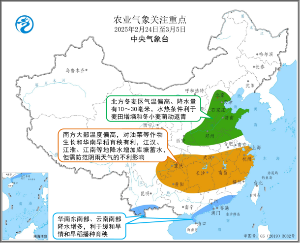 北方冬麦区根据天气变化以及苗情、墒情加强麦田分类管理,促进苗情转化升级。长江中下游地区要做好蓄水储水,降水偏多地区及时清沟理渠,防止湿渍害发生;油麦产区根据苗情科学施肥,促进作物生长发育。华南早稻产区要密切关注天气变化,利用“冷尾暖头”适时开展早稻育秧工作,已播地区加强秧苗管理。西南地区需做好水源调度工作,确保夏收粮油作物生产用水和春播用水需求。此外,农作物病虫害将逐渐进入高发期,各地要做好病虫害监测及防治工作。 / C q6 r) a7 h# m7 z