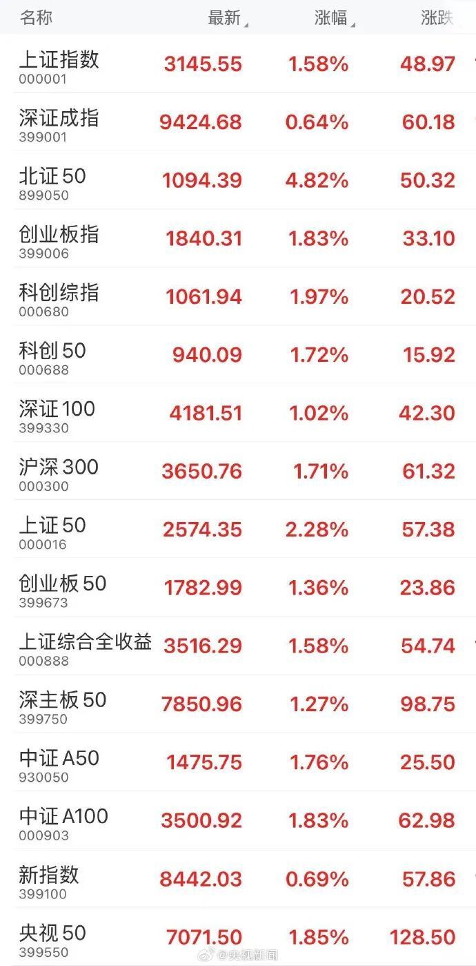1、A股收涨,全线飘红 8日收盘,上证指数(000001)涨1.58%,深证成指(399001)涨0.64%,创业板指(399006)涨1.83%。反关税概念股持续发酵,农业股方向领涨;大消费集体反弹,零售、食品、白酒涨幅居前;电力、房地产、金融涨幅居前。(央视新闻)$ y" c- m" B* P/ ^! I; e* K
