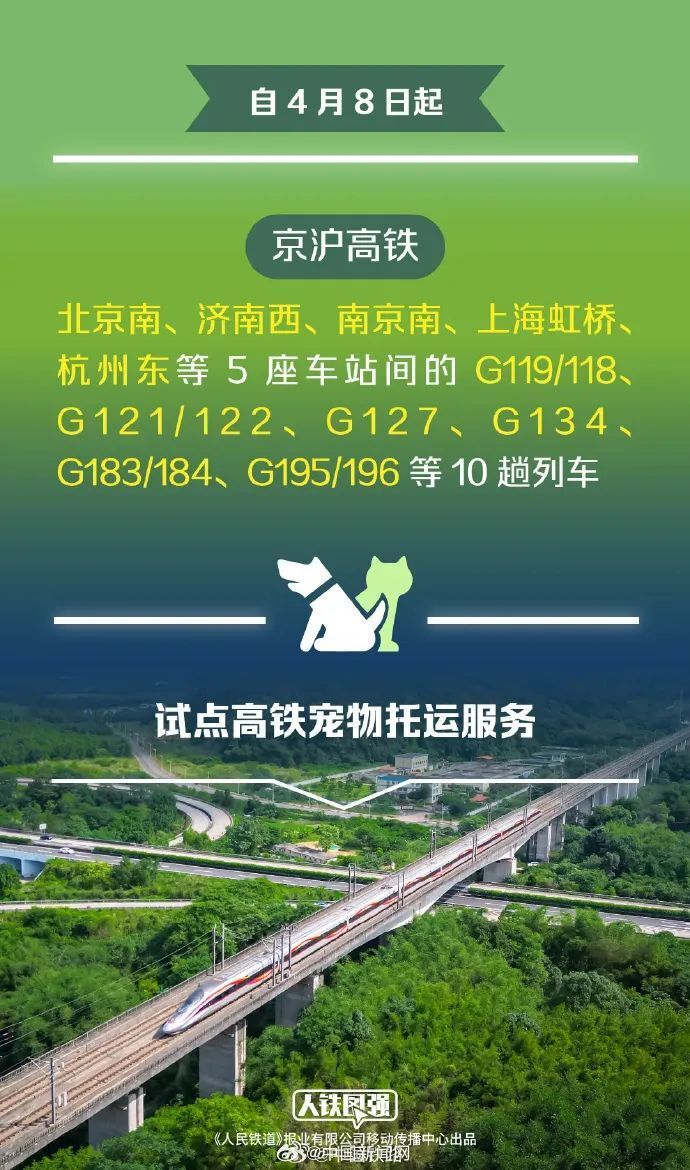 K; H! l' e9 q3、高铁宠物托运服务来了 铁路部门在京沪高铁部分车次试点“隔离运输、人宠分开、专人看护”的高铁宠物托运服务,铁路12306同步推出“宠物托运”功能,旅客提前2天及以上线上预约,预约成功后可同车托运1只家庭驯养且健康状况良好、单只体重不超过15公斤、肩高不超过40厘米的猫、犬类宠物。(中国铁路)