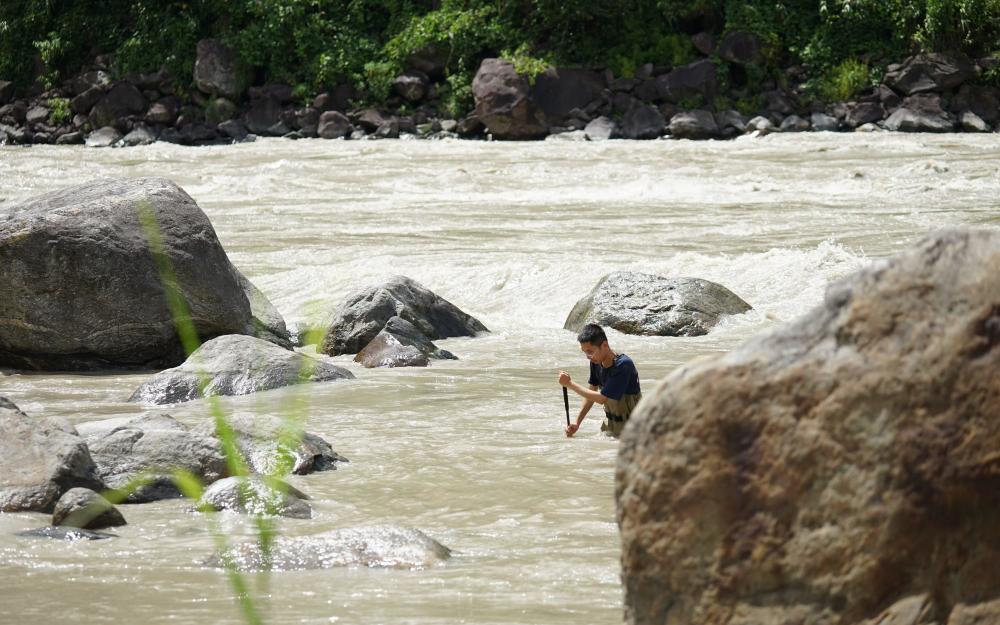 3 I: M0 q. i3 K4 q2023年7月,郑徐弘毅在西藏墨脱的雅鲁藏布江中捞蜉蝣。受访者供图