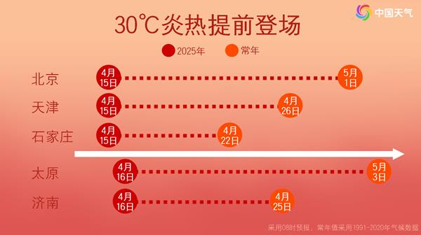 4月15日开始,我国中东部大部气温迅速冲高,未来三天多地气温会达到近期高点,石家庄、郑州或现今年首个高温日,并打破北方省会、直辖市、首府最早高温日纪录。