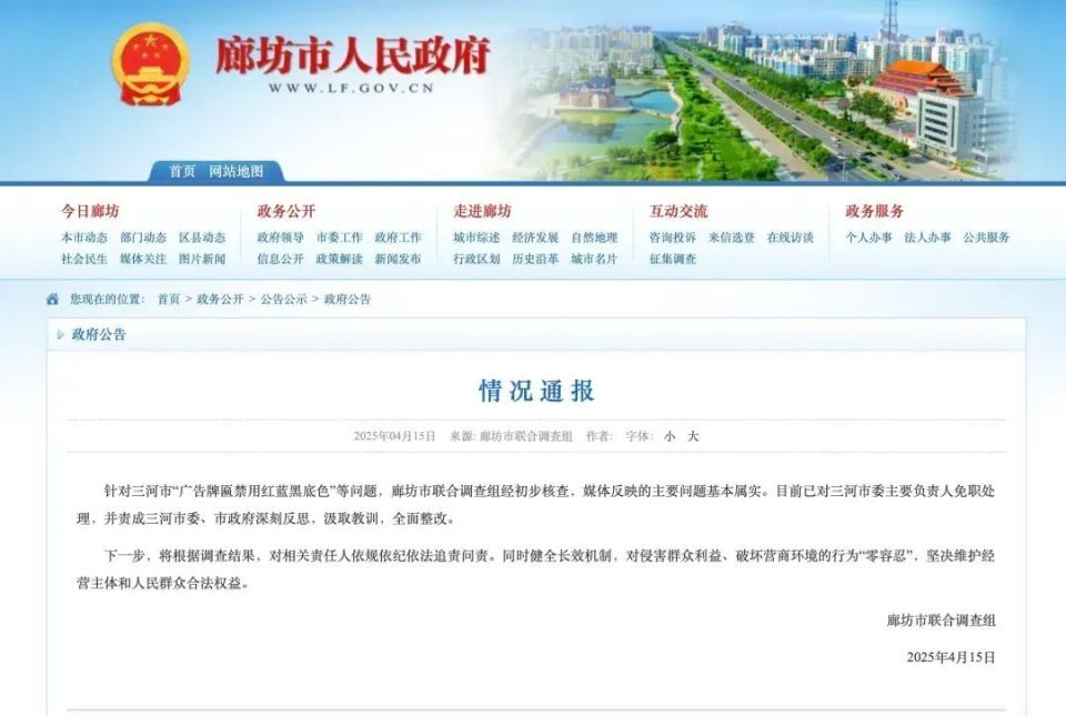 4月15日,河北省廊坊市联合调查组发布情况通报,针对三河市“广告牌匾禁用红蓝黑底色”等问题,廊坊市联合调查组经初步核查,媒体反映的主要问题基本属实。目前已对三河市委主要负责人免职处理,并责成三河市委、市政府深刻反思,汲取教训,全面整改。