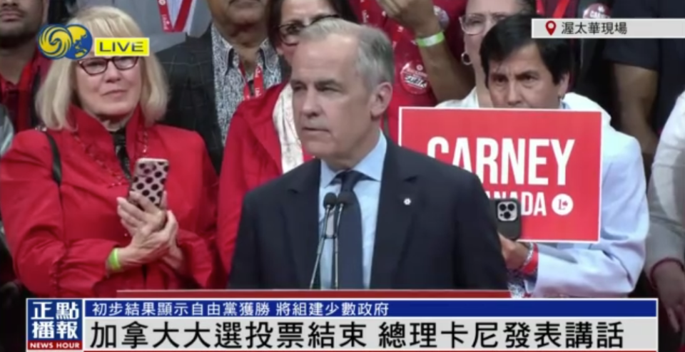 5 G( {+ ^# k3 t, d( ~% P加拿大自由党领袖卡尼发表胜选讲话