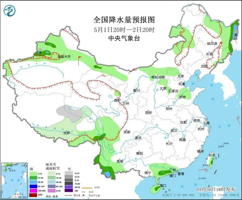 5月1日20时至2日20时,西藏南部和东北部、青海西南部等地部分地区有小雪或雨夹雪。新疆北部、内蒙古、黑龙江中东部、吉林东部、河北北部、山西北部、山东西北部、西藏东部、四川西部、云南西部和南部、华南南部等地部分地区有小到中雨,其中,新疆伊犁河谷、黑龙江东部、云南南部等地局地有大雨(25~40毫米)。新疆东部、内蒙古中部、甘肃河西等地部分地区有4~6级风,其中,新疆东部部分地区有7~8级风。