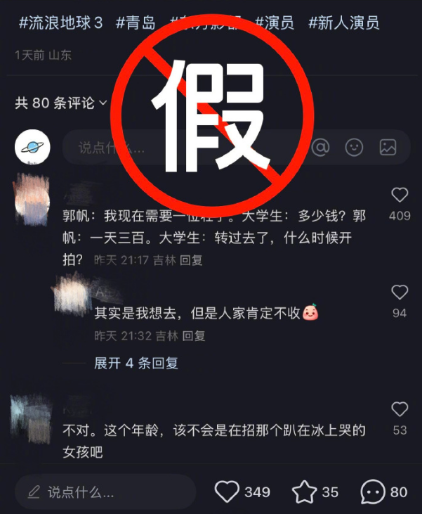 2、流浪地球3在线辟谣 电影流浪地球官方微博发文1日:近日,电影《流浪地球3》剧组发现有第三方机构或个人冒用郭帆导演、剧组合作方等身份,通过社交平台自媒体账号对外发布“临时演员招募通知”“投资方招募”等信息,诱导公众联络。提醒大家注意所谓“演员招募”“投资方募资”等虚假信息,提高警惕。(@央视新闻)+ {7 W( ?- y! X7 Y