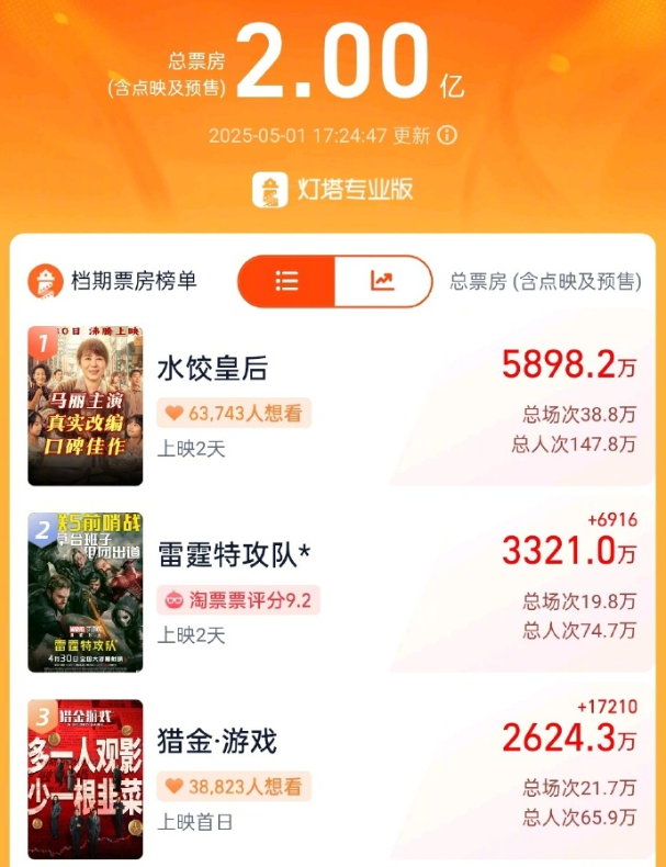 4、五一档新片总票房破2亿 据网络平台数据,截至5月1日17时24分,2025年五一档电影新片(含重映)总票房(含点映及预售)突破2亿,影片《水饺皇后》《雷霆特攻队》《猎金·游戏》《人生开门红》《幽灵公主》《苍茫的天涯是我的爱》暂列前六。(@中国新闻网)